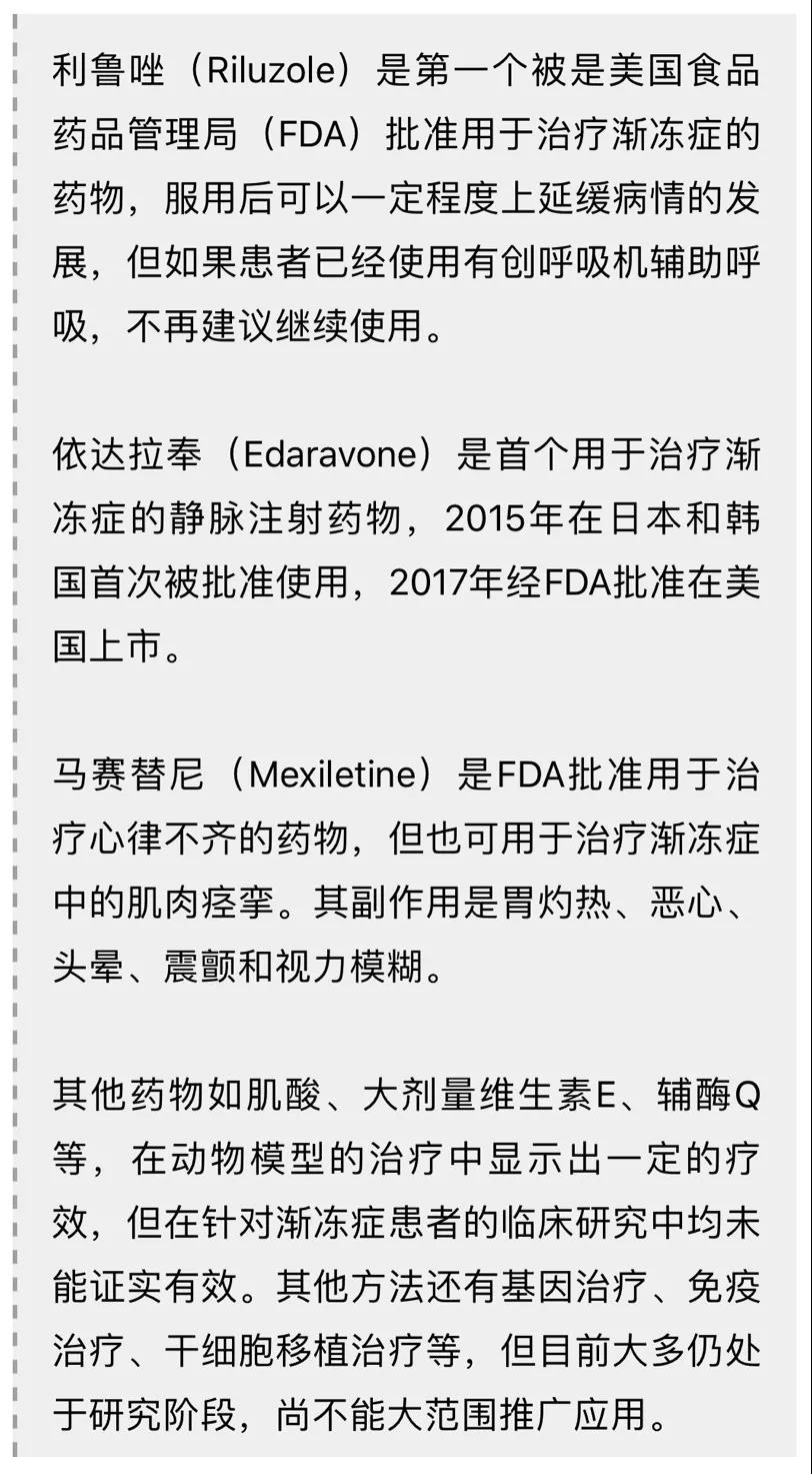 由于病因不明确,渐冻症的药物治疗以延缓疾病发展为目的。目前国际上用于治疗渐冻症的药物主要有3种: